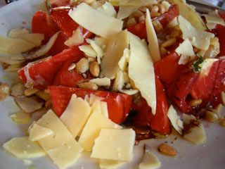 Time for the next course: a salad of plump and bright red beefsteak tomatoes from Heidi Watanabe, inspiring oohs and ahhs from everyone as the platters landed on the table. These sweet beauties were served slightly chilled with pine nuts, roasted garlic, shavings of Parmesan, and olive oil and balsamic, a simple and lovely combination that was creamy, nutty, and tangy.