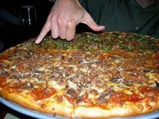 I managed to finish one slice of each. And that was it--wave the yellow caution flag. These pizzas are hefty and mean business--if they were a person, they would be a big guy named Tiny, who lives to collect, and eat. This pie could easily feed four hungry stoners who have been harvesting all day.