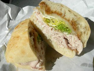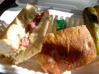 The line was about ten people deep, but moved impressively quickly. Some folks try to get there early to beat the line, and get their pick of the litter before anything runs out. Inside, the staff is hustling. Dennis Leary, the powerhouse for this outfit, is behind the counter daily, moving intently like the prizefighter of sandwiches. I just hope he doesn't give himself a coronary before he's 40--the guy is like a downed power line, rippling around with an intensity that makes you keep your distance. I've never seen him stand still.