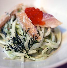 A refreshing start is the smoked trout ($11) served on a bed of cucumber masquerading as linguine, dressed in dill crème fraîche, and topped with the salty pop of trout roe. And like linguine, it takes a little negotiating to successfully spin the strands on your fork, but with one bite, the sexy texture of this dish makes it worth the effort.