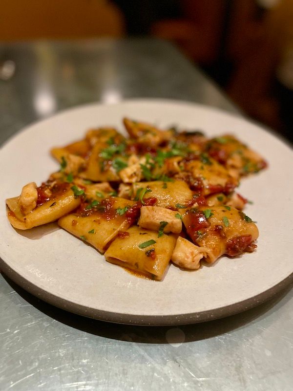 It was the paccheri all’amalfitana ($29) that lured me in: housemade paccheri with Half Moon Bay petrale sole instead of the traditional tuna, with a luscious tomato sauce that had some agrodolce notes that made it seem Sicilian (now the dish features Dungeness crab). For full decadence, the lasagnette del bosco (bianca, with ricotta, spinach, black truffle; $38) made my friend exclaim, “It’s like a pasta wedding cake!”